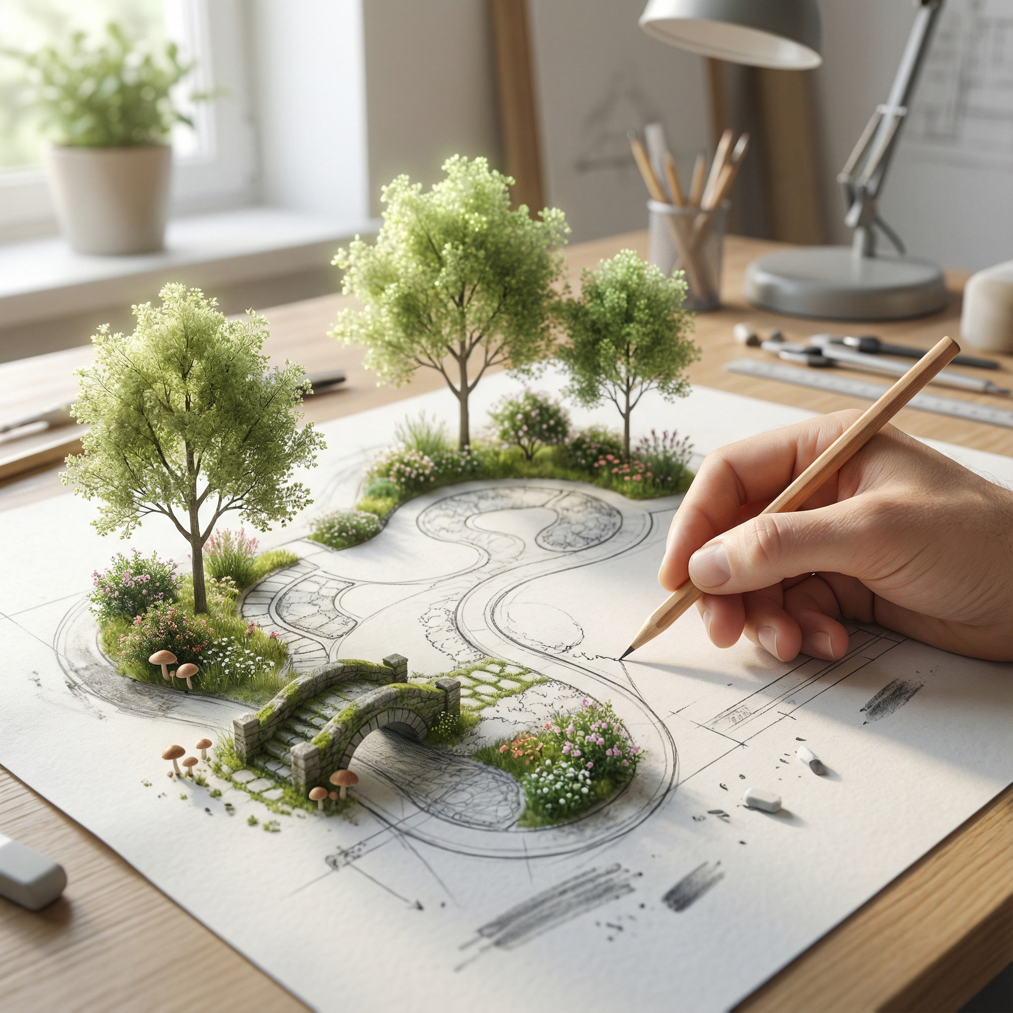 Creative landscape planning with lawns, plants, walkways, and aesthetic outdoor elements.